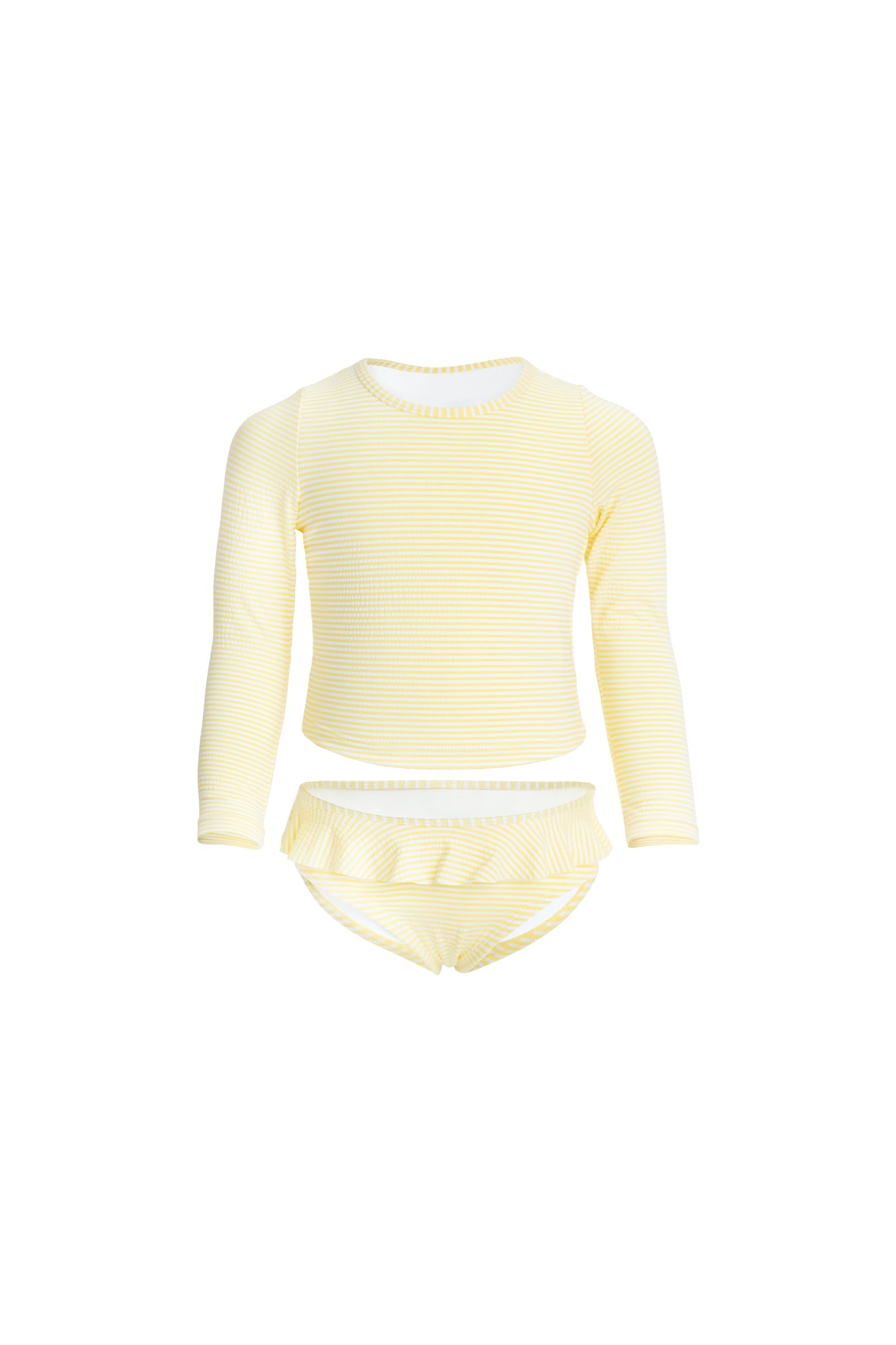 Let your little one splash in style with the Brielle Swim Set in Camomile Stripe. This sweet two-piece features a soft yellow and white stripe, with a long-sleeved top for added sun coverage and bikini-style bottoms adorned with a delicate frill at the hips. Designed for both play and protection, it’s the perfect blend of comfort and charm.