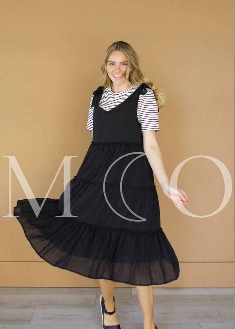 A perfect lightweight jumper that has POCKETS! Design details also include a 3 tiered skirt, modern V- neckline front and back to wear any cute top under, forgiving waist and fit with darling shoulder ties! A design that is ready for work or play! Designed with you in mind with a loose and comfortable fit! Available in XS-XXL Shown in Black, also available in Barbie Pink and Sage Green.