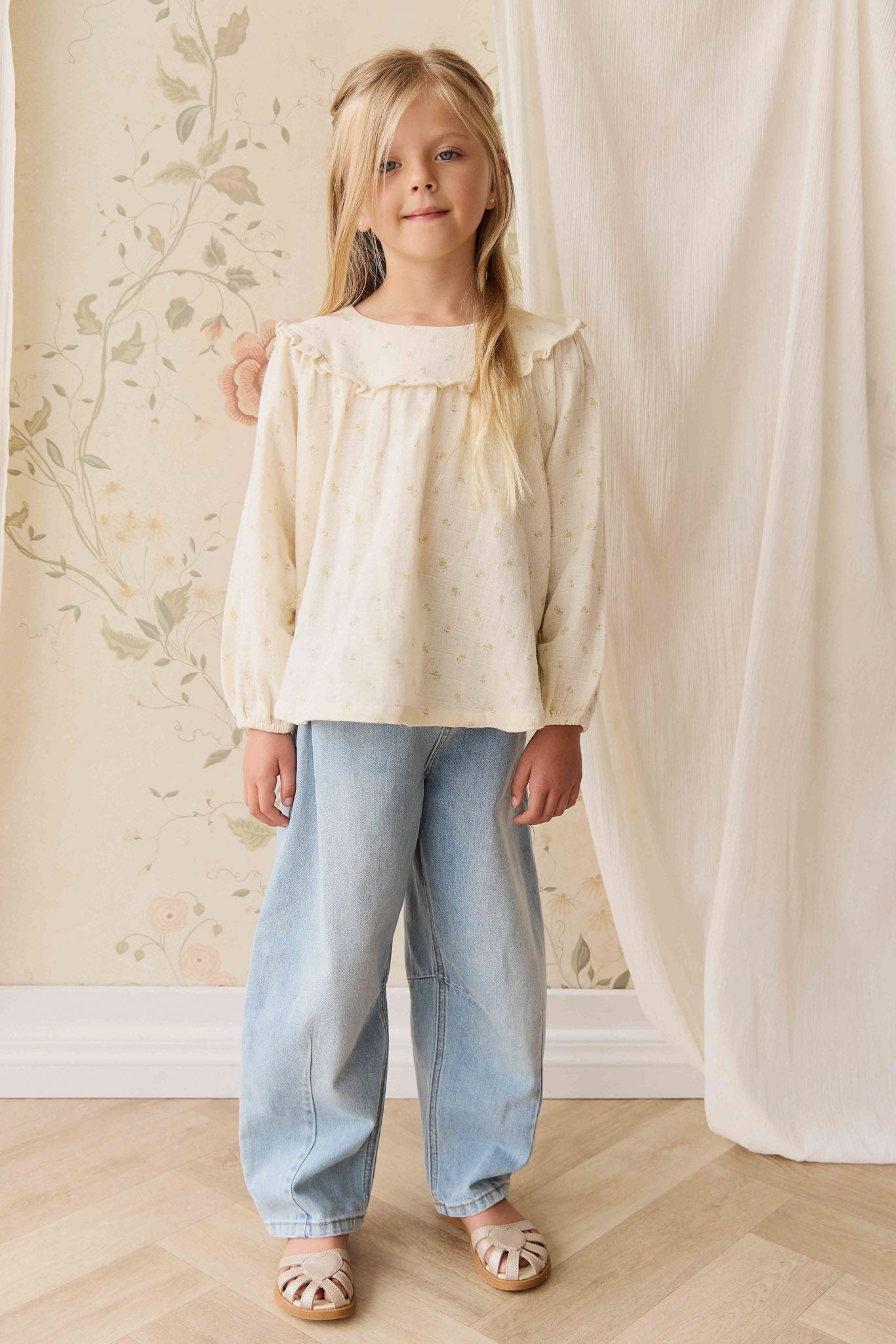 A delicate floral dream for your little one. The Amira Blouse in Vintage Ditsy features a soft white base adorned with tiny yellow florals, a ruffled collar, and long sleeves—perfect for layering or wearing on its own. This timeless piece brings a touch of vintage charm to everyday dressing.