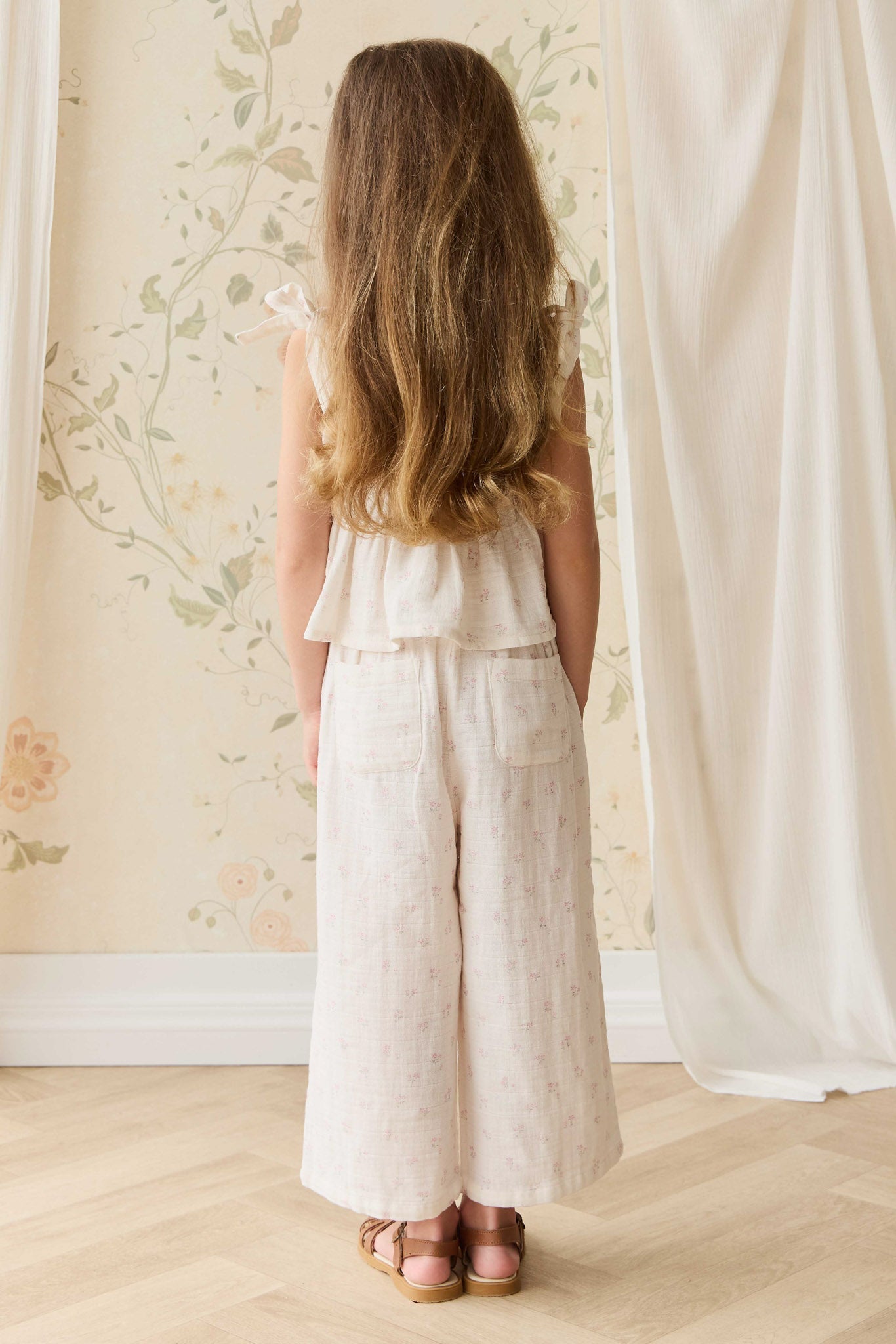 A beautifully soft and relaxed pant for everyday wear. The Odette Pant in Pauline Pink features a light pink floral muslin base, a wide-leg silhouette, and an elasticated waistband for all-day comfort. Two back pockets add a sweet and practical touch, making these pants perfect for playtime or dressing up.